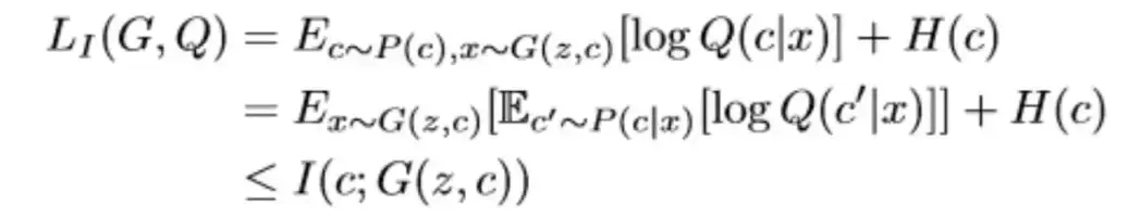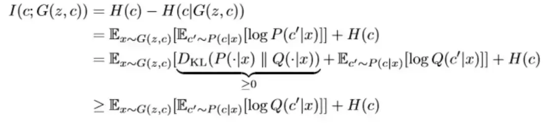 然而在互信息I(c; G(z, c))的优化中,真实的P(c|x)很难计算,因此作者采用了变分推断的思想,引入了变分分布Q(c|x)来逼近P(c|x),