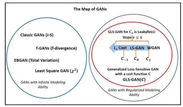 以上的GAN在本质上的目标是让真实分布pr与生成分布pg尽量接近,大多数GAN之间可以解释成其区别在于衡量方式不同,比如朴素GAN的Jensen-Shannon散度,WGAN的Wasserstein距离,f-GANs的f散度等等。