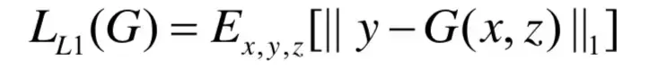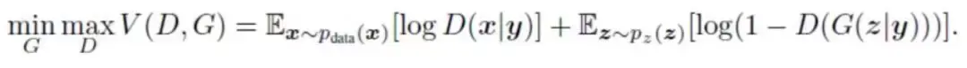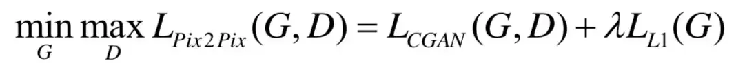 Pix2Pix的目标函数分为两部分,首先是基于CGAN的目标函数,如下式所示,