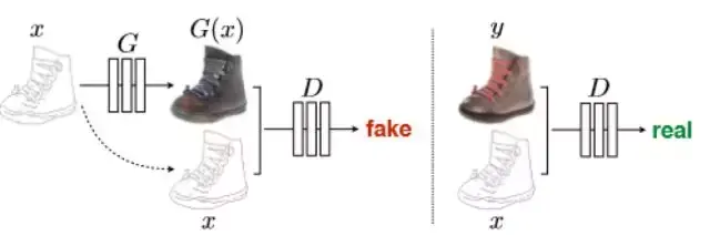 因此,生成器输入除随机数z以外,将图片x(如灰度图,素描图等)作为条件进行拼接,输出的是转换后的图片(如照片)。而判别器输入的是转换后的图片或真实照片,特别之处在于,文章发现,判别器也将生成器输入的图片x作为条件进行拼接,会极大提高实验的结果,其结构图如下所示(此处结构图隐去了生成器的随机数z)