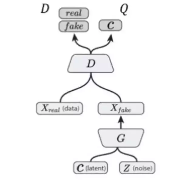 Q通过与D共享卷积层,计算花销大大减少。此外,Q是一个变分分布,在神经网络中直接最大化,Q也可以视作一个判别器,输出类别c。