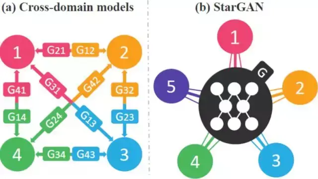 由上所述,Pix2Pix解决了有配对的图像翻译问题,CycleGAN解决了无配对的图像翻译问题,然而无论是Pix2Pix又或者是Cycle,他们对图像翻译而言,都是一对一的,也即是一类图像对一类图像。然而涉及多类图像之间的转换,就需要CycleGAN进行一对一逐个训练,如图6(a)所示,显然这样的行为是极为低效的。
