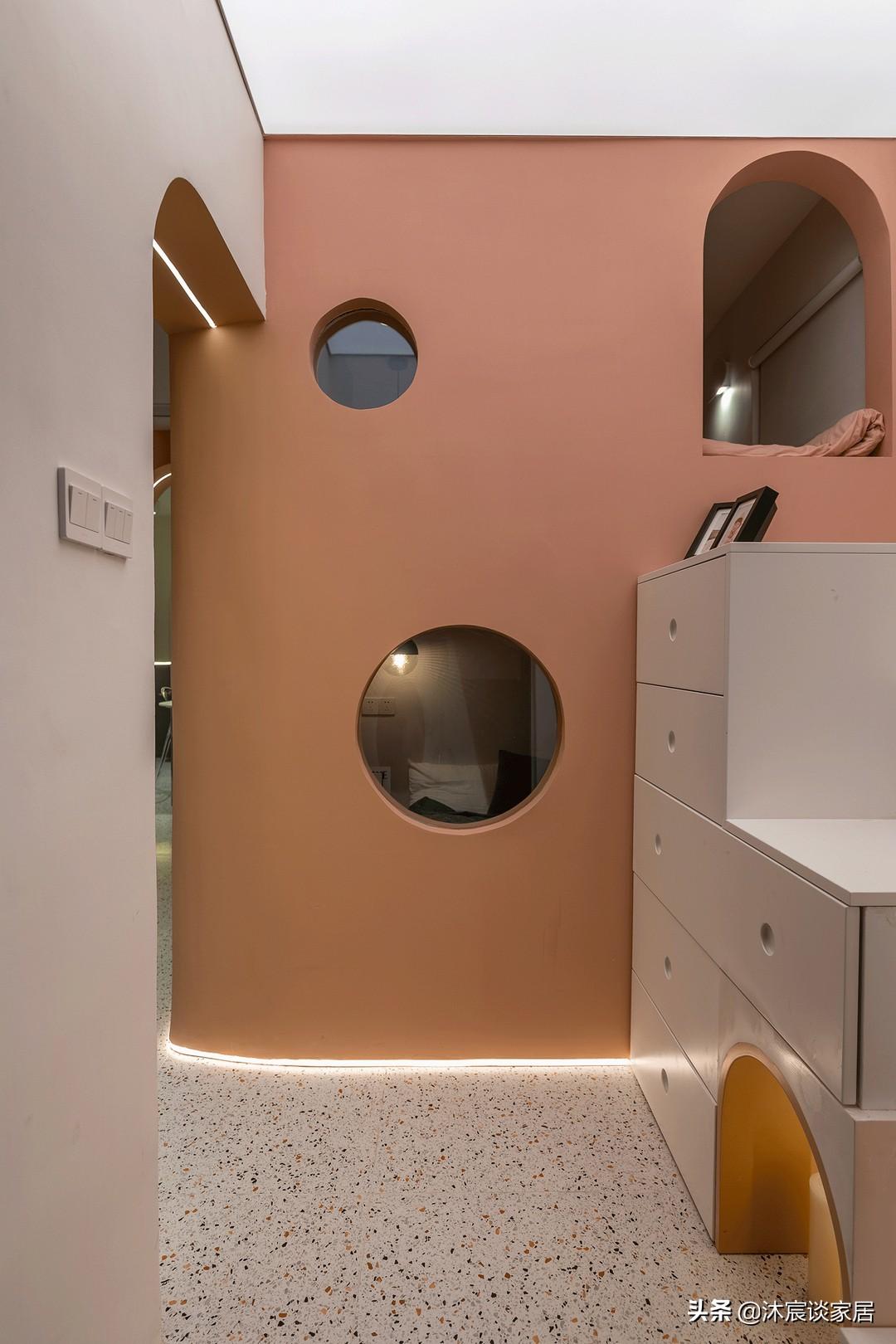 其实走廊也很短,但美而惊艳还实用,正对父母房就是收纳柜,把洗衣机嵌入进去,相当完美,还有大柜体,把家里林林总总的生活物品全装进去,甚至还制作半弧形门洞,装上灯带,温馨的暖色,时尚的水磨石地面,让这个迷你宅脱胎换骨。