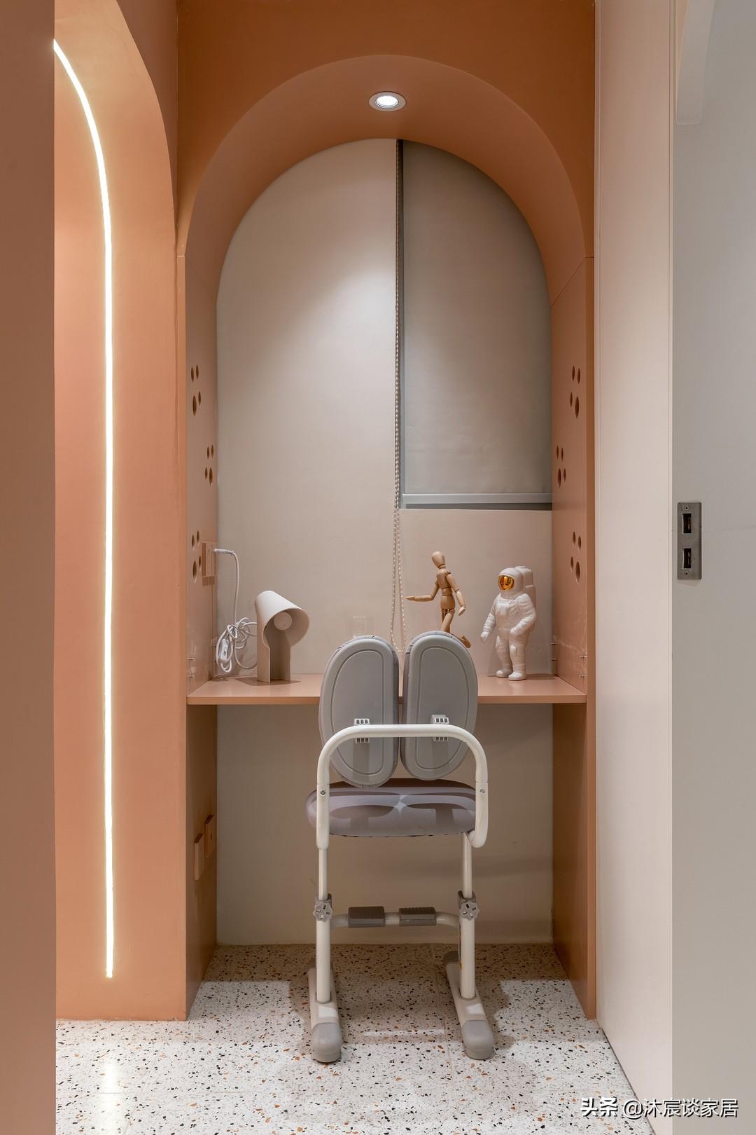 这个阅读区是女孩的写字空间,拱形门洞与镂空猫爪印增添空间的趣味效果,还缓和学习的枯燥性,但你以为又只是这样吗?
