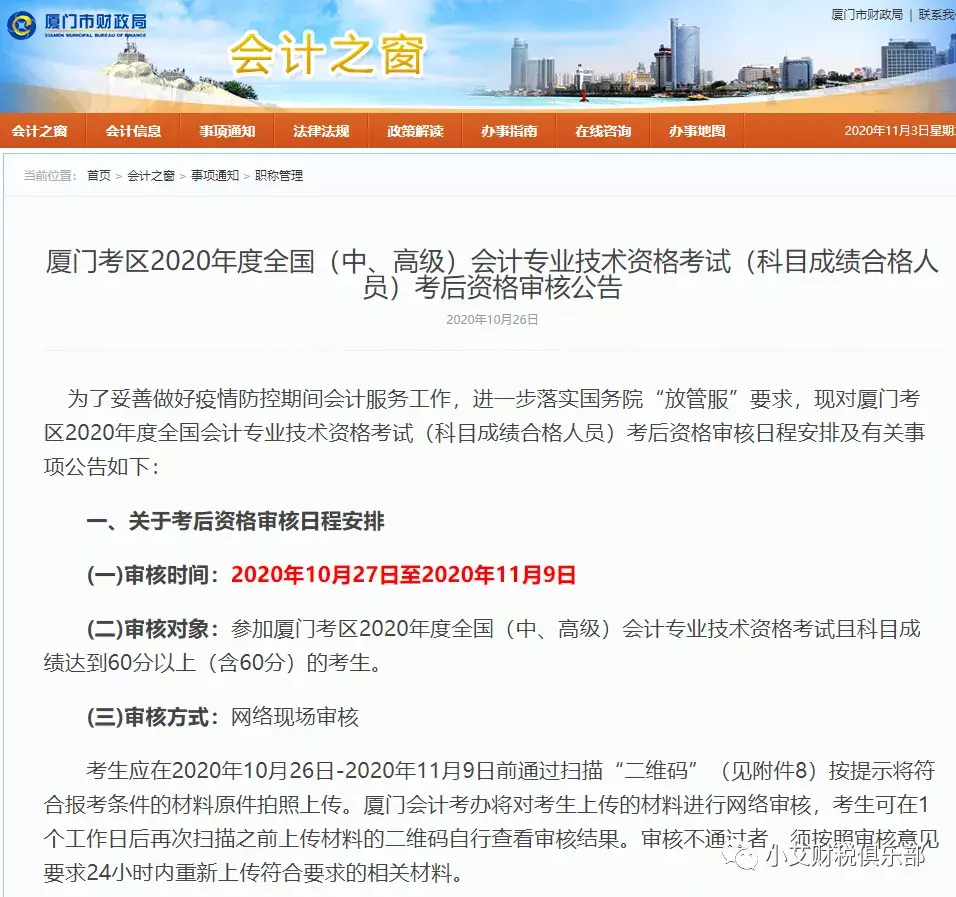 厦门地区的小伙伴注意了,参加2020年中级考试并且成绩达到60分以上,就要完成考后资格审核,如果错过资格审核,成绩就作废啦,明年需要重考。