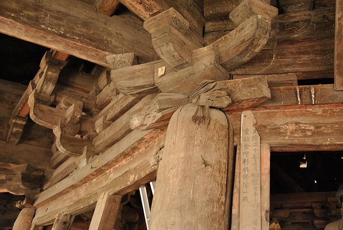 柱头斗栱五铺作,双杪偷心造,形制十分简洁,斗栱上的二跳华栱为四椽栿伸出檐外制成,柱头间不设补间铺作,二跳华栱直接承托替木和撩檐槫,无耍头。柱头扶壁栱的做法是在素枋上下分别施泥道栱和令栱,这种“栱枋重复式”多见于南方,在北方早期建筑中尚属孤例。只有大殿的开间、梁架、斗栱等仍为唐代原制,甚为可贵。