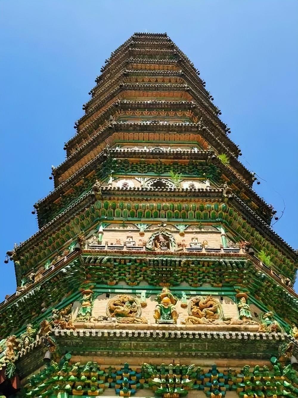 洪洞广胜寺飞虹琉璃塔建于明代正德年间,是目前全国最精美、保存最完好的琉璃塔,被称为广胜寺一绝。飞虹塔屹立于山门的正面,全部由砖砌而成,为楼阁式密宗塔,呈八角形共13层,塔身通高47.31米,砖砌的塔身装饰着琉璃烧制的屋宇、神龛、角柱、斗拱、栏板、宝瓶、花罩、莲瓣、花卉、龙凤、金刚力士、童子、菩萨、仙人等多种构件,造型生动逼真,色彩鲜艳夺目。