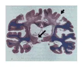 图 | Quinlan 大脑的光学显微镜图。短箭头所指是大脑皮层及下面的白质有严重萎缩,长箭头所指是丘脑两侧严重萎缩。