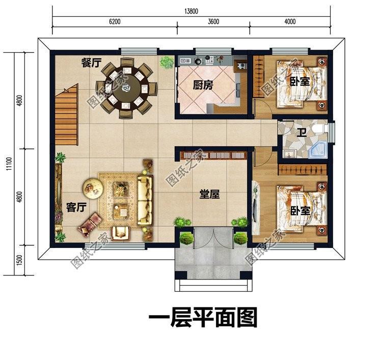 一层户型:堂屋、客厅、餐厅、厨房、卧室x2、卫生间;