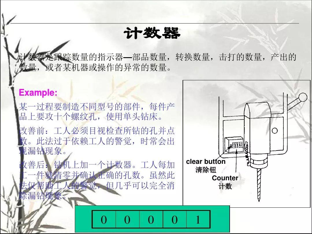 消除:将可能错误消除在过程和产品被重新设计的过程中;替代:是进入更可靠的过程的一个变更;简单化:将过程运行变的更简单化,也更可靠;检测:使错误在下一步操作前被发现;缓和:是将错误的影响降低到最低。1. 设备上的防错装置技术应用