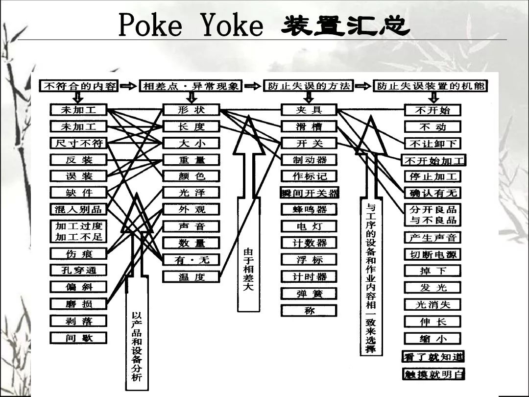 即时摄片比较:区分装配零件的方向是否正确;传感器感应检测:机加工自动线根据不同产品型号的外形变化,传感器将感应到的信息反馈给后面的加工工序,使后面的工序调用对应的加工程序,实施相应的加工内容;加工孔探测:在机加工线中的钻孔或攻丝后的工位,对加工孔的断刀检测及切屑冲洗;硬靠山:认准工件的前后流向,如在缸体加工自动线的进料口,利用缸体前后端面的宽度差异,设定硬靠山,保证缸体进入机加工线时前端面流向在前硬探头:检测零件的不同型号,实施不同的装配或加工工艺,如用探头探测零件的外形,实施不同的装配,如硬探头探测缸孔,区分3.0L或3.4L缸体;导向挡块:区分零件的输送导向;光栅防错:通过光栅的检测控制,达到工件是否摆放到位夹具防错:控制装配零件在夹具上的摆放是否到位来防错。(2) 定量的防错