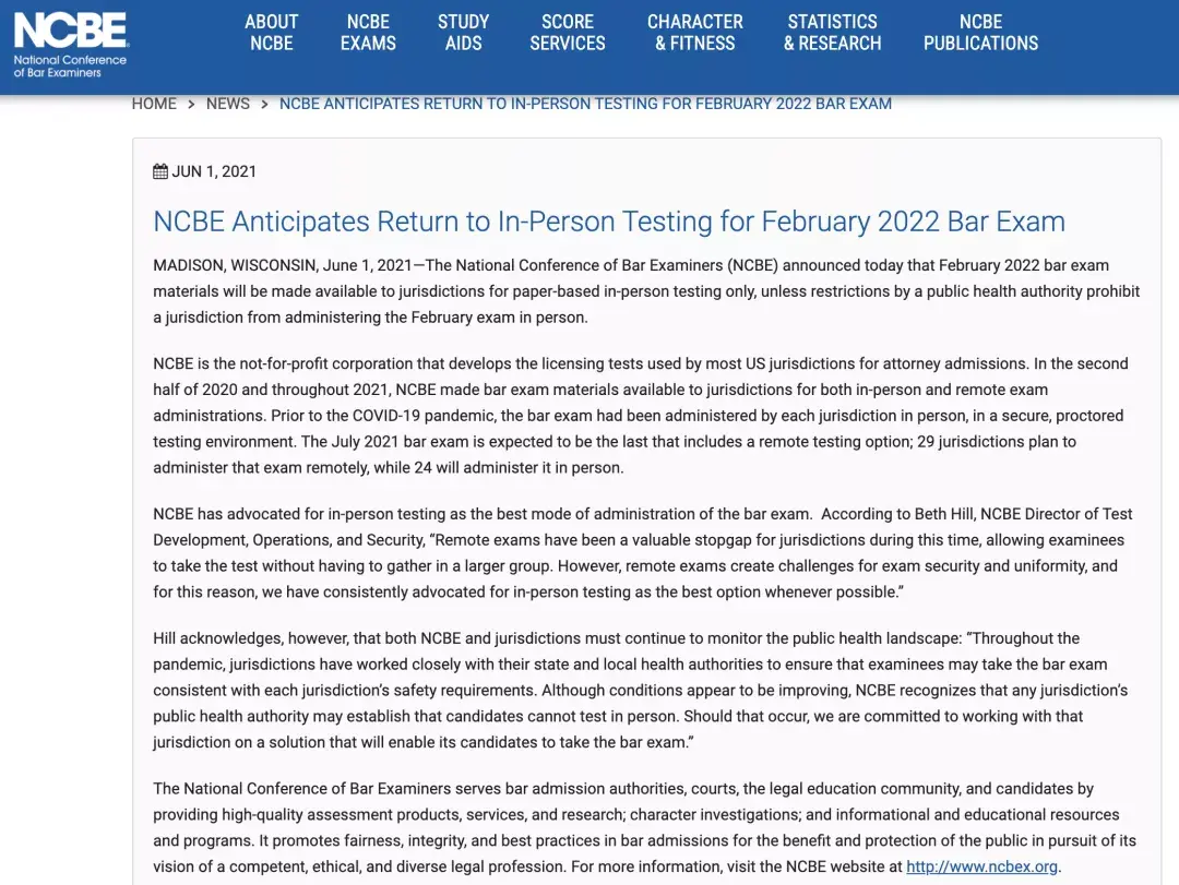 NCBE在2021年6月1日正式宣布,2022年2月的律师考试材料将只提供给用于纸质现场考试的司法管辖区,除非公共卫生机构的限制禁止司法管辖区采用线下方式进行2月的考试。