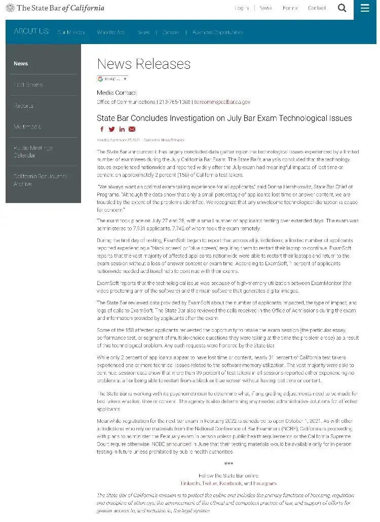 在这份详尽的技术调查报告中,加州律师协会首先总结了7月份加州律师考试的情况,他们已经基本完成了对7月加州律师考试期间少数考生所遇到技术问题的数据收集工作,并对所出现的突发状况和考生诉求进行了分析和回应。