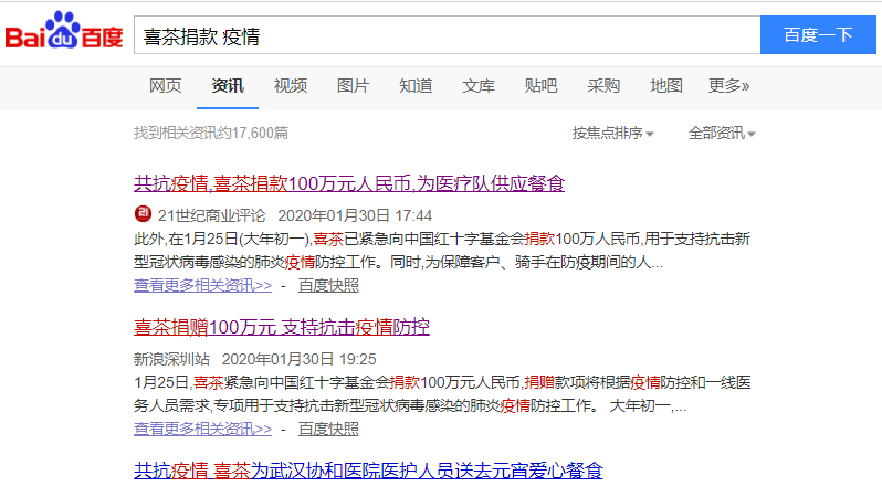 关于喜茶捐款100万的消息自2020年1月25日在中国红十字基金会官网爆出,全国各地报纸、网络媒体纷纷跟进报道,各类微博、微信等自媒体也纷纷借此进行发散传播。截止发稿之日,小编搜索“喜茶捐款疫情”关键词,出现了超过1.7万篇相关资讯。