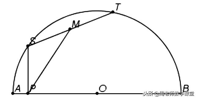 如图,定长的弦ST在一个以AB为直径的半圆上滑动,M是ST的中点,P是S对AB作垂线的垂足,求证:不管ST滑到什么位置,∠SPM是一个定角。