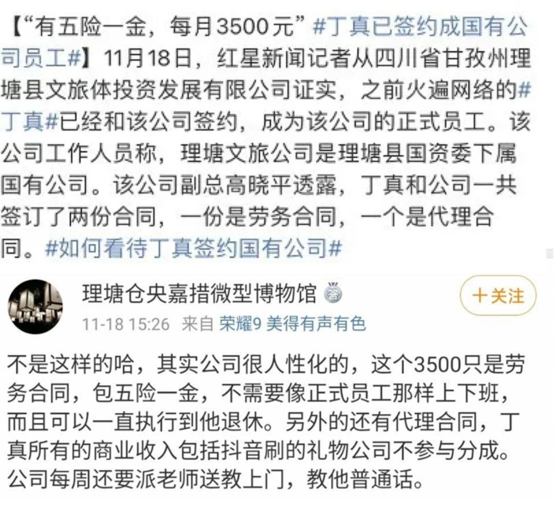 原来,丁真进了国企——理塘仓央嘉措微型博物馆,每月工资3500元,还有五险一金。