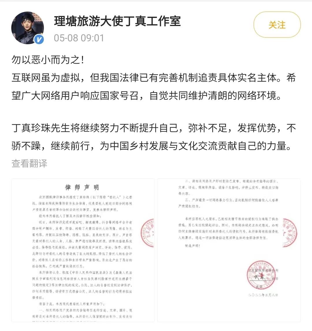5月8日,丁真的工作室发布声明,呼吁大家不要再给丁真p黑图了,公司已经请了律师来追究这些人的法律责任,并且义正词严地说“勿以恶小而为之”。
