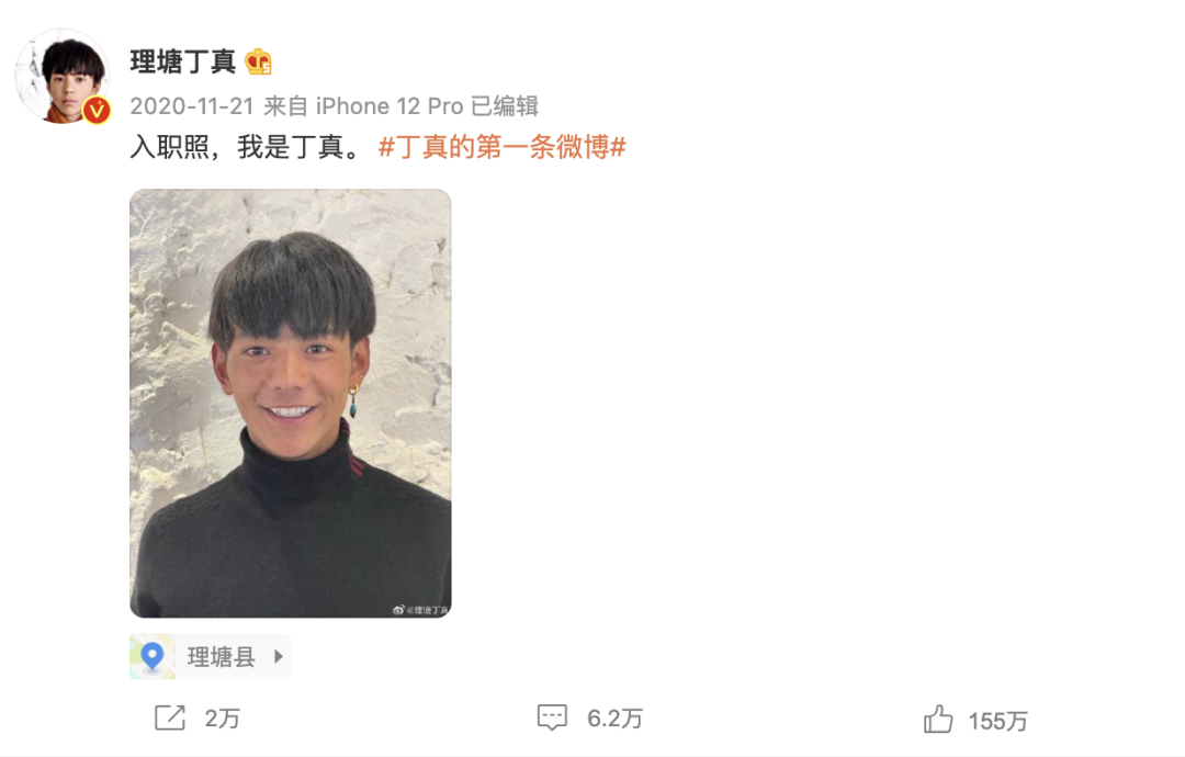 本以为走红的丁真要被资本收割,但在11月21日,丁真以“理塘丁真”的名字发了一条微博:“入职照”。