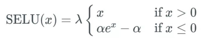 可以看到,它们的小数点后还有很多位,这是为了绝对精度。而且它们是预先确定的,也就是说我们不必担心如何为这个激活函数选取合适的 α 值。说实话,这个公式看起来和其它公式或多或少有些类似。所有新的激活函数看起来就像是其它已有的激活函数的组合。SELU 的公式如下: