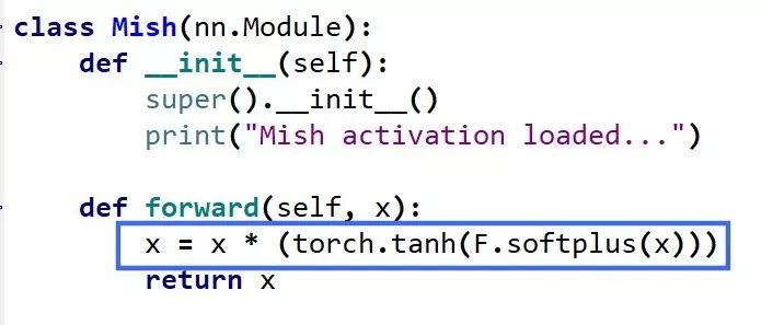 直接看Mish的代码会更简单一点,简单总结一下,Mish=x * tanh(ln(1+e^x))。