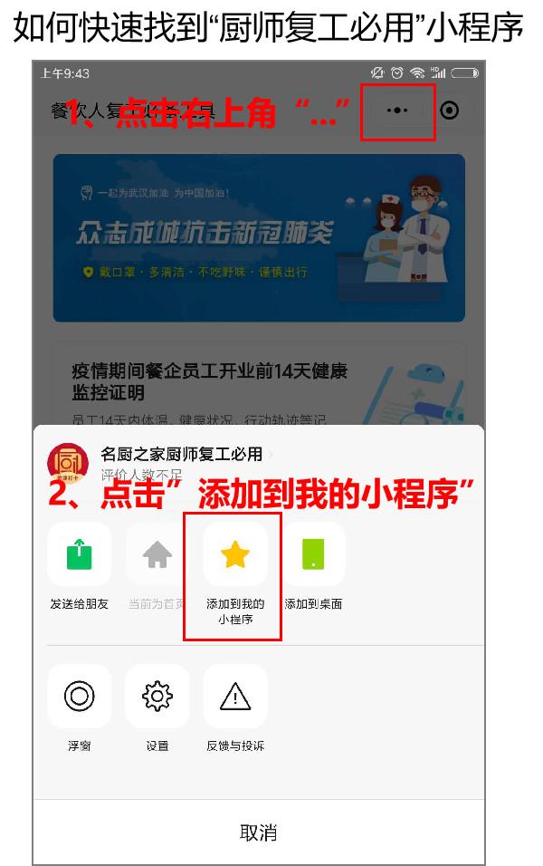找不到小程序?打开【名厨之家订阅号】,点击菜单栏【复工必备】即可打卡。