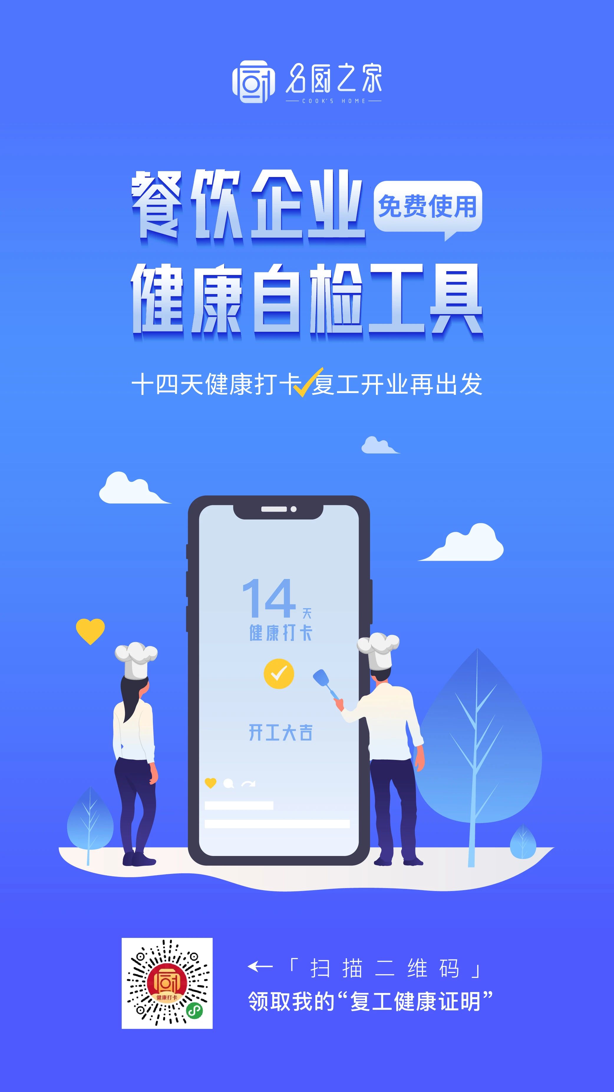名厨之家响应国家复工政策,为了帮助各餐饮企业及时有效的记录员工在监测隔离14天期间的健康状况,特推出了一款实用的复工打卡小程序【名厨之家厨师复工必用】,大家只需要坚持14天不间断地每天上线打卡记录,如果在打卡期间未出现异常健康状况,14天观察期结束后,你就可以领取一个复工健康证明,并顺利复工。