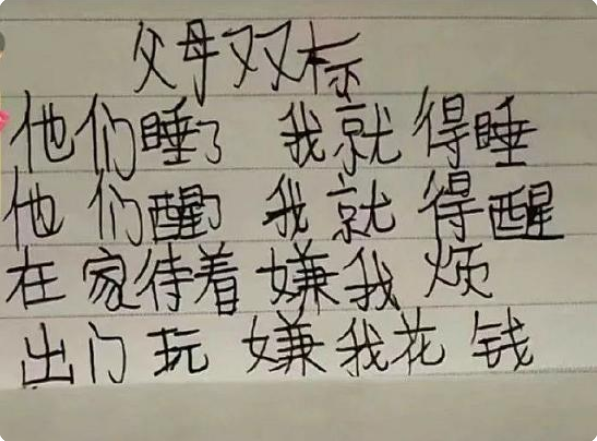 面对孩子这样直白地“质问”,家长们看完以后也无法反驳,只能默默地举起鸡毛掸子,让孩子接受新一轮“爱的教育”。