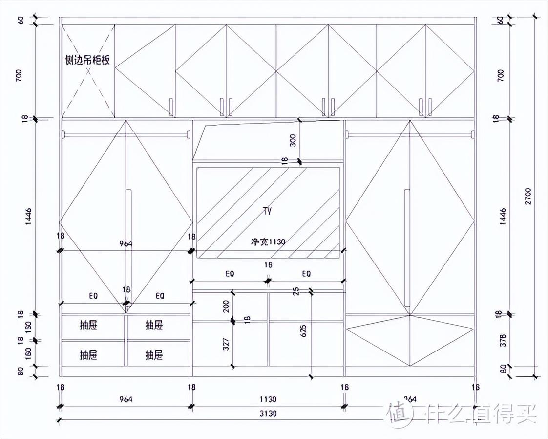 中间是电视墙,周围是“顶天立地”式,全部打满,侧墙位置不够做落地橱了,就在上方打上一排吊柜。