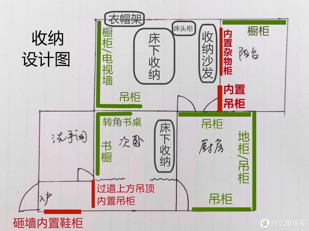 图片里红色线条是砸墙或者加吊顶做的内置橱柜,绿色线条是靠墙打的大面积橱柜,黑色框是带收纳功能的家具。