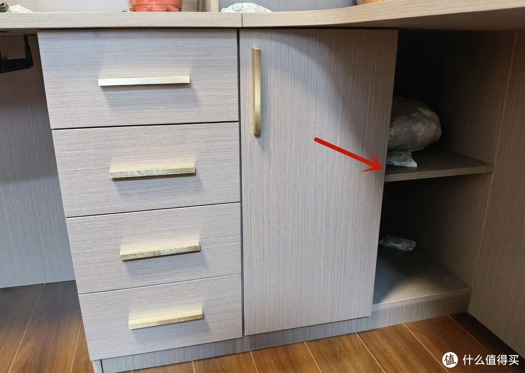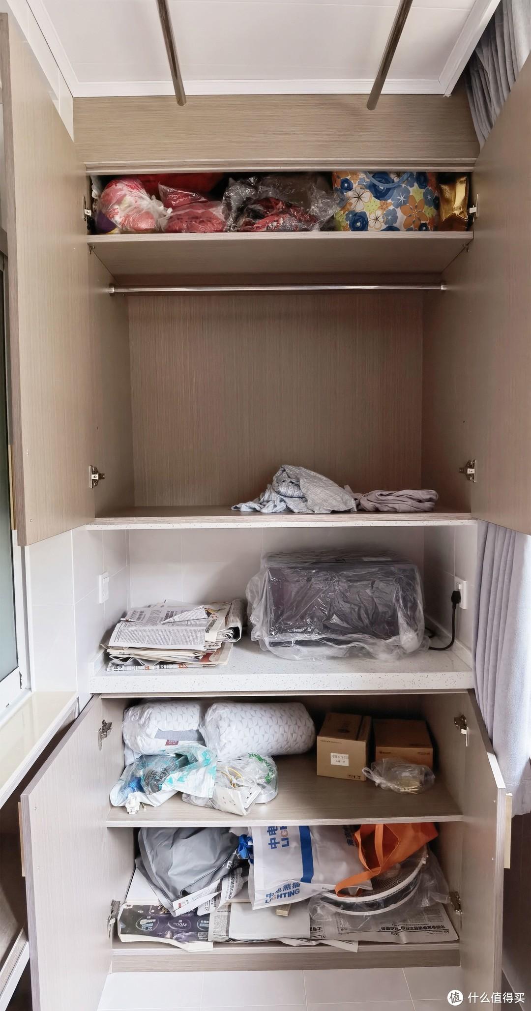 考虑到家里换季需要空间存放大尺寸的电器,比如落地电风扇、暖气等等,因此这个柜子就没有再做隔层,整个是一体的,专放大物件。