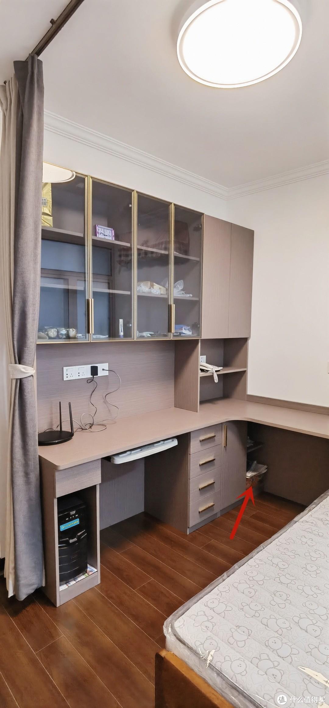 次卧书柜是采用了最省空间的上下橱+转角书桌的组合。