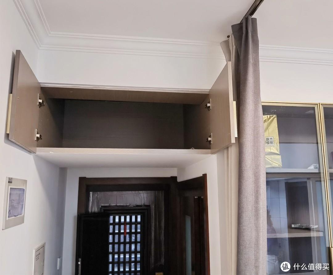 过道这一块天花板也不能浪费!我们做了一个吊顶,并且做了加固,设计成了收纳柜,又多出1㎡的空间来。