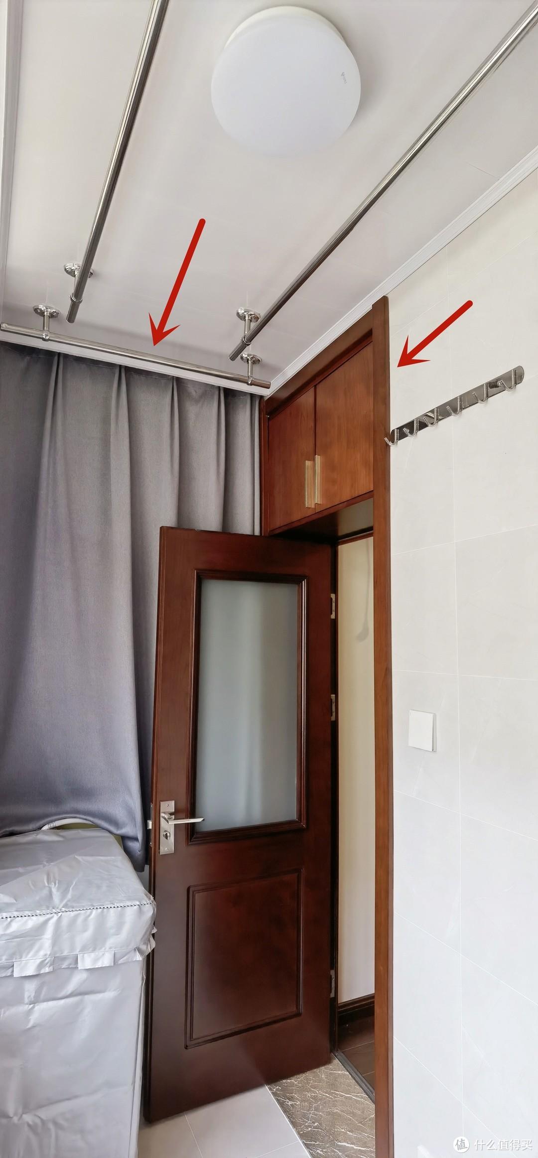 阳台门上方把墙掏空,做个隐藏小吊柜。晾晒区不大,那就横头多加一根晾衣杆,碰上阴雨天也好应付。