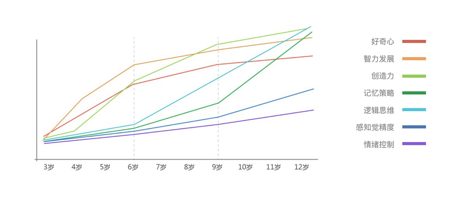 儿童在3-6岁时好奇心和智力发展是很迅速的,而在7-9岁儿童发展较为快速的是创造力和逻辑思维,10-12岁的儿童发展较为快速的是记忆策略。