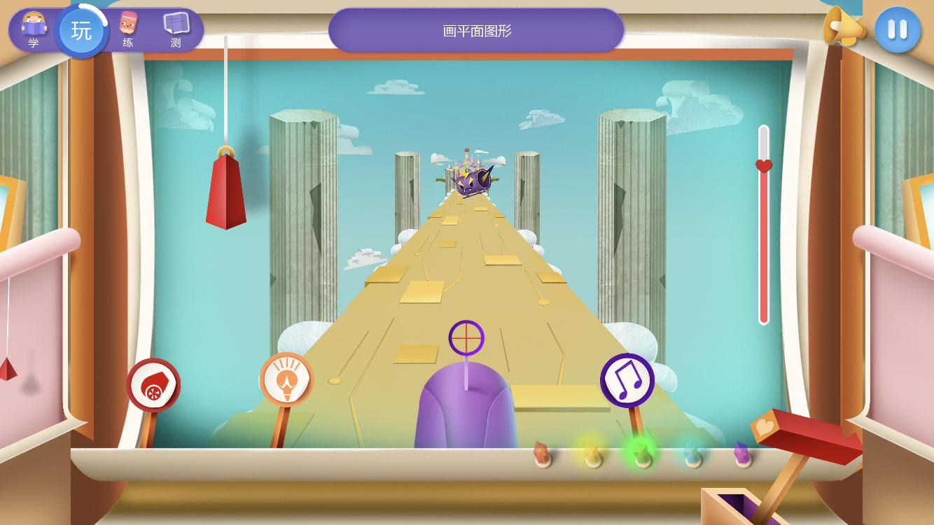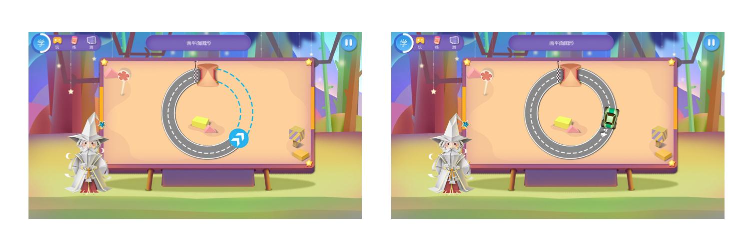 例如下面这个学习画圆形练习题,前期强指引动画引导儿童如何操作,激发探索欲与操作欲望,当儿童按照引导画出一个圆形后,有小车出现,并按跑道跑了一圈。这是一个很有意思的过程,利用儿童的好奇心激发探索的欲望。