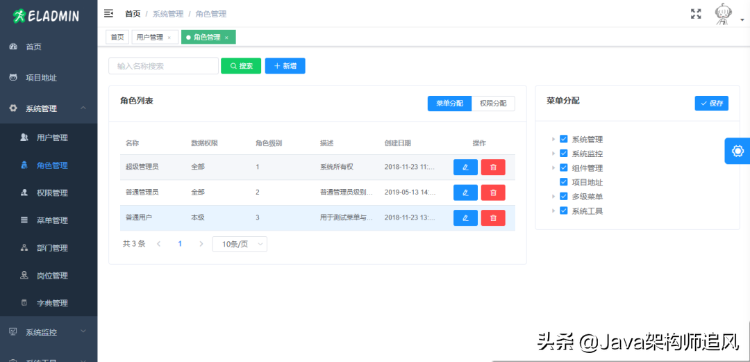 项目简介: eladmin是一个基于 Spring Boot + Vue的前后端分离的后台管理系统,项目采用分模块开发方式, 权限控制采用 RBAC,支持数据字典与数据权限管理,支持一键生成前后端代码,支持动态路由,对于初学者还是比较友好的。