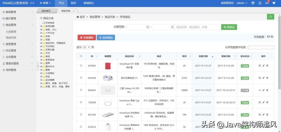 项目简介:mall项目是一套电商系统,包括前台商城系统及后台管理系统,基于SpringBoot+MyBatis实现,采用Docker容器化部署。前台商城系统包含首页门户、商品推荐、商品搜索、商品展示、购物车、订单流程、会员中心、客户服务、帮助中心等模块。后台管理系统包含商品管理、订单管理、会员管理、促销管理、运营管理、内容管理、统计报表、财务管理、权限管理、设置等模块。