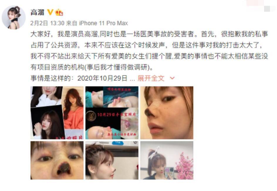 2021年,高溜在微博上发布一篇长文讲述了自己整容失败的经历。