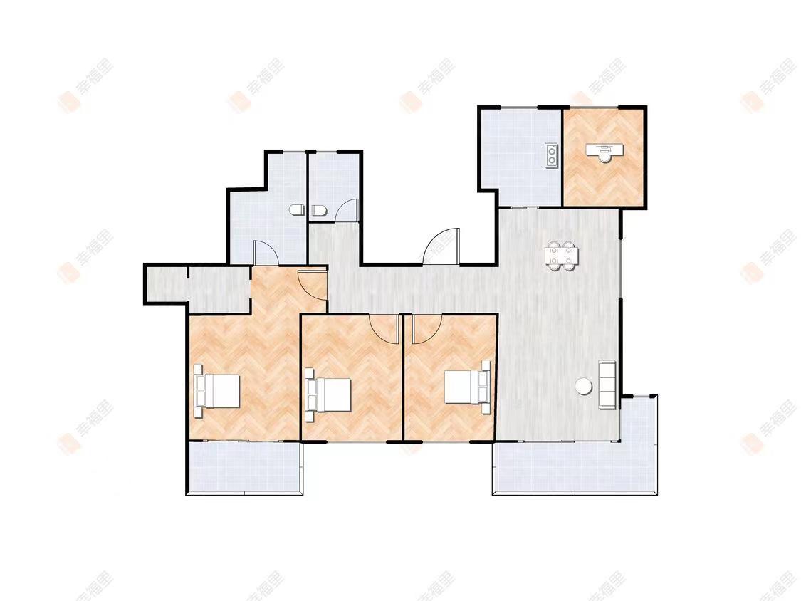 户型优点:无过道浪费,空间利用率高;大阳台,采光佳。