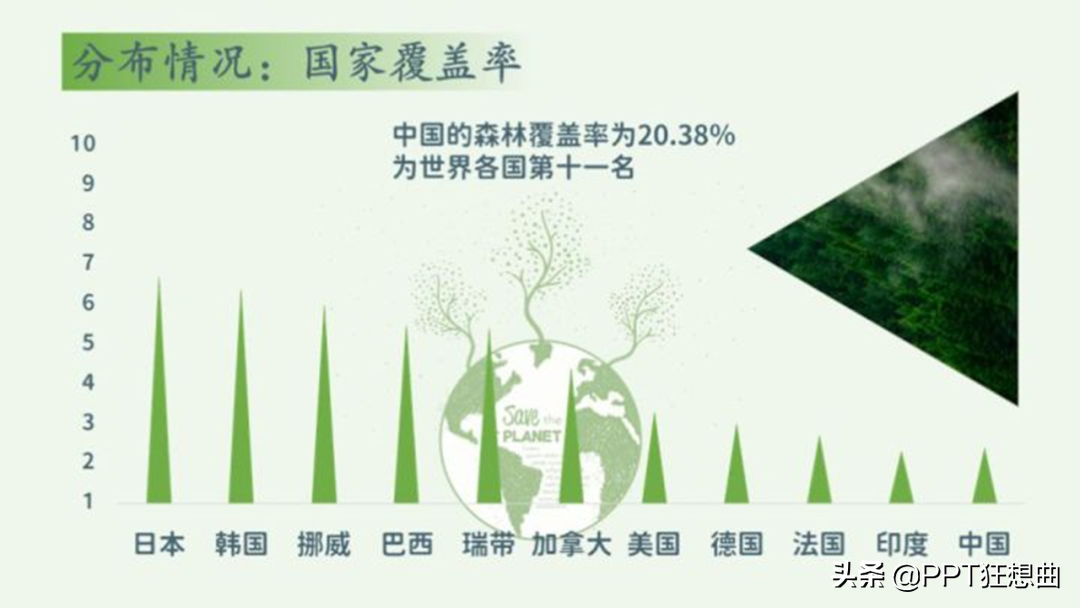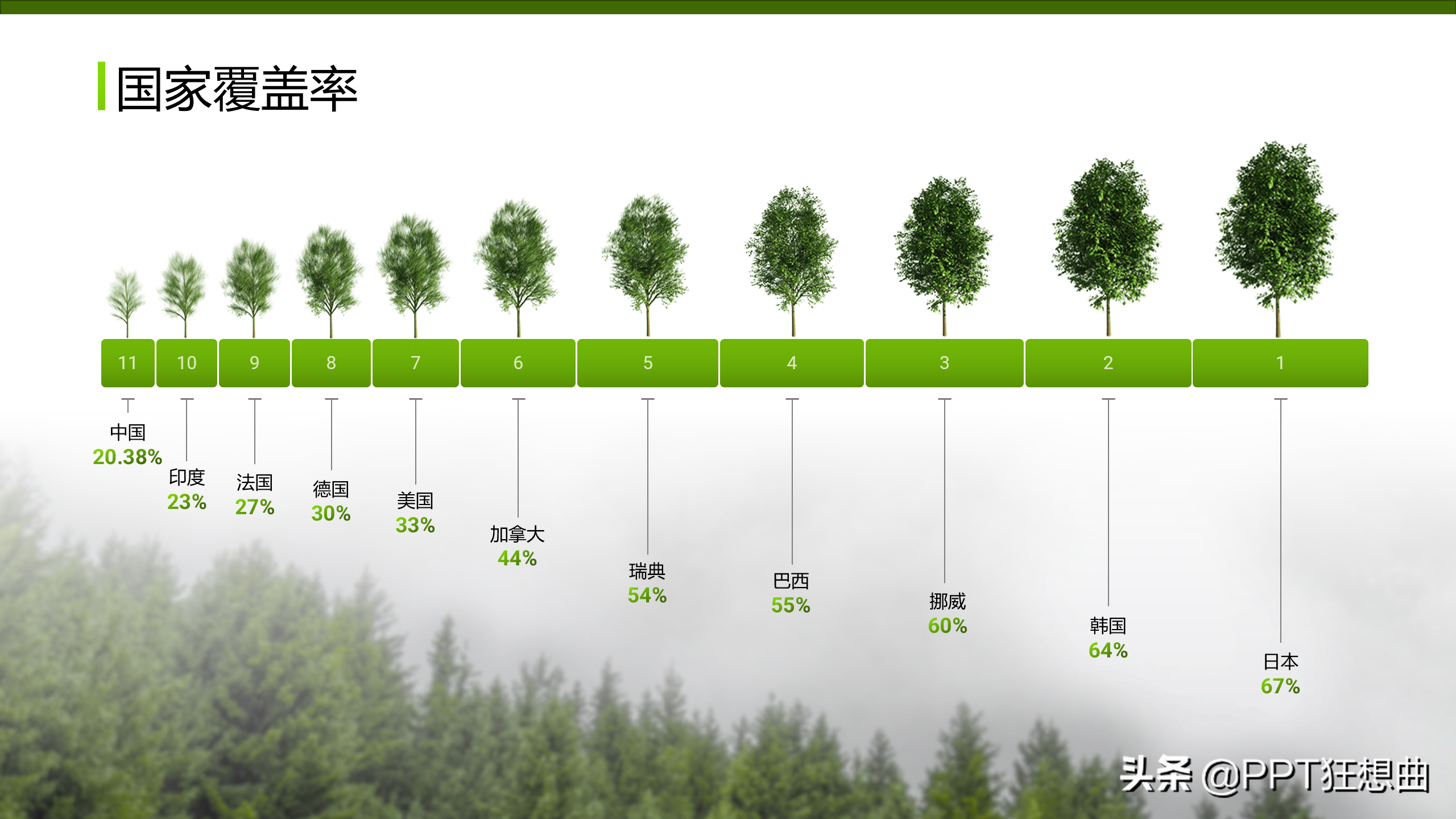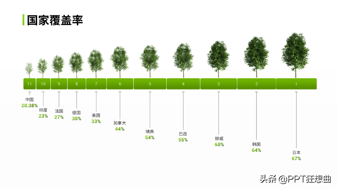 在我做这页数据图表的时候,我利用树木的繁茂程度,将各个国家的覆盖率进行可视化。