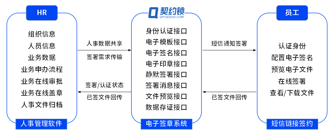 以组织现有管理软件作为统一操作平台,在流程中便捷调用契约锁功能应用接口完成签署。不改变原有人事办公习惯,实现人事文件在线审批、网上签约、自动归档。目前,契约锁电子签章系统已经与近20家人事管理软件实现集成应用。