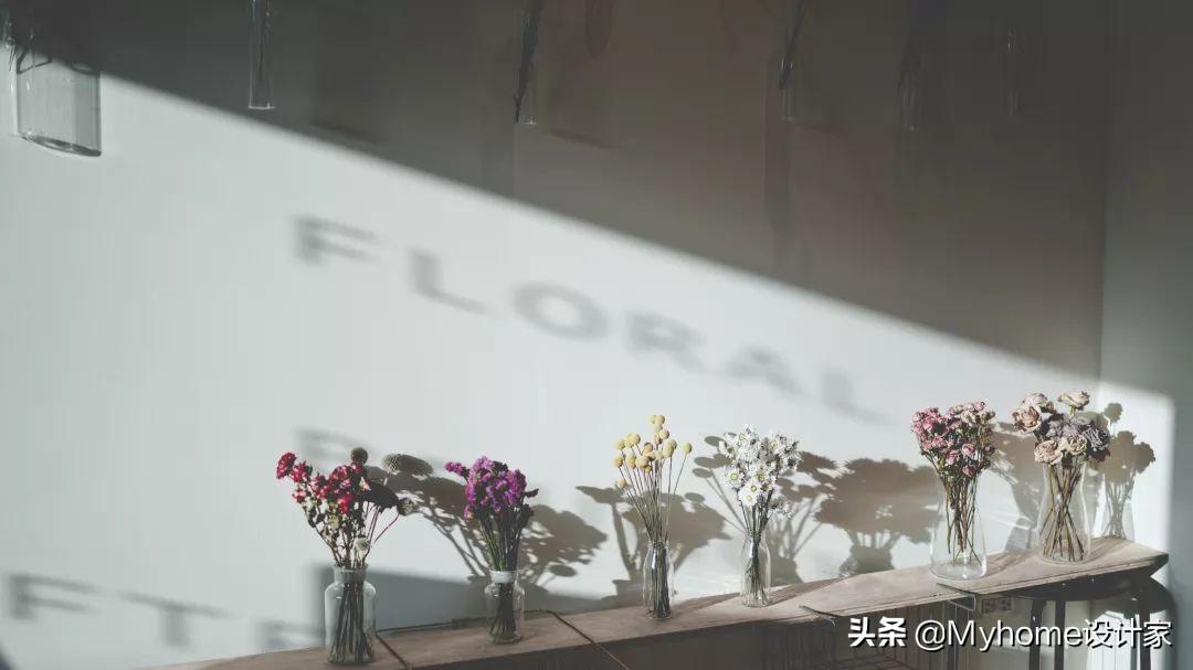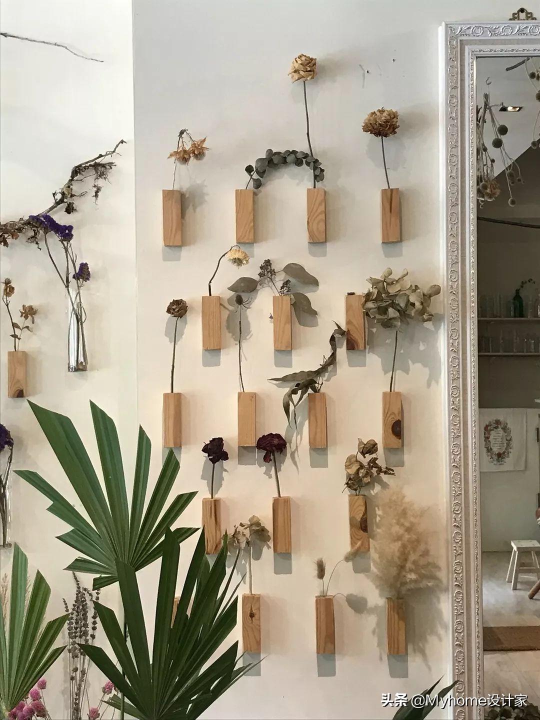 空间中唯一的大面白墙以木条挖洞、透明管作为盛装花材的容器,摆上各式各样的单枝花黏贴于墙上,成为趣味又唯美的墙面设计。不仅成为花艺店代表性主墙,也减少了购买花器的预算,同时提供了一目了然的花材展示,方便客人挑选花束。