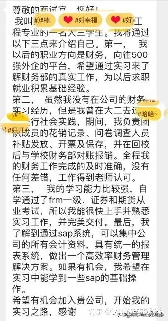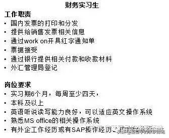 实习生招聘,面向大三,有实习时间要求;做的事情融合了出纳和销售助理;对英语有要求;熟悉财务相关技能或学习能力强,执行力强。