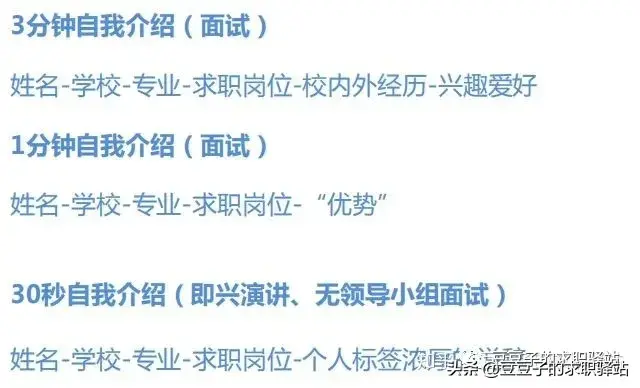 (1)30s-1min以内:常见于群面,如无领导小组,辩论赛,即兴演讲,需要你在正式面试前向大家介绍你,目的只有一个——让面试官记住你(不至于写面试记录的时候记错你的名字)。