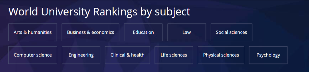 在11项分类,计算机科学、工程、法律、商业与经济学、临床与健康、物理学、社会科学、生命科学、教育、艺术与人文、心理学中,新加坡国立大学7大类排名均在全球前20 ,9大类排在前30,新加坡另一所公立大学—南洋理工大学也有两大类排名前20 。