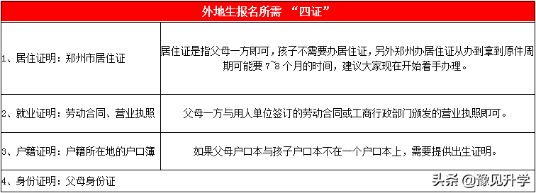 答:按规定,孩子户口不在郑州市区,只能按外来务工人员随迁子女报名。报名时,需要提供“四证”。