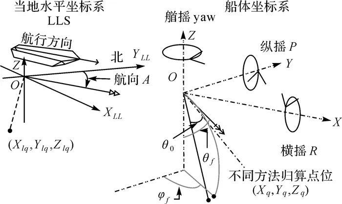 Rob Hare模型是研究多波束测深各误差源影响量级分析的经典位置归算模型,其基本思想是按坐标旋转的方式构建测深中心与测深点之间的关系模型。即首先建立以接收换能器几何中心为坐标系原点的船体坐标系(载体固联坐标系)O→(X,Y,Z)和当地水平坐标系(LLS)O→(XLL,YLL,Z),各坐标轴指向如图 1所示。设波束指向角为θ0(波束方向与换能器平面垂向夹角),r为θ0方向上测得的斜距。姿态测量横摇角roll为R(左舷向上为正)、纵摇角pitch为P(船艏向上为正)、航向角为A(艏摇yaw方向相同),在船体坐标系下,测深点q的坐标(xq,yq,zq),在当地水平坐标系(LLS)下,经动态偏心改正(ΔXat, ΔYat, ΔZat),设定位设备中心在船体坐标系中的坐标为(xa,ya,za),则测深点q的坐标(xlq,ylq,zlq)表示为