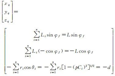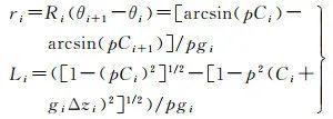 式中,ri为每层声波传播距离;Ri、Li分别对应其曲率半径和水平位移。若将声线每层圆弧路径的微分单元近似取为其对应的弦长,并结合每层精确波束入射角θi,则可计算声线在整个水柱中的垂直位移。则在船体坐标系中海底点(xq, yq, zq)的坐标表达式为