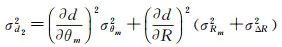 (2) 波束指向角误差(包含横摇误差)。σRm与σΔR表示运动传感器的横摇角R测量误差和稳定性试验的未校准误差(安装偏差误差)。波束指向角对测深误差贡献量σd2可表示为