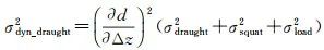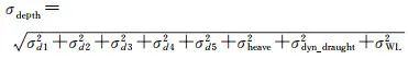 (7) 吃水误差。draught表示测船静止时的吃水,squat表示测船航行时,由于船速造成的吃水的改变,load为在航行中,由于油料消耗等原因造成的测船吃水的改变与升沉误差影响方式相同,其总吃水误差对测深误差贡献量σdyn_draught为